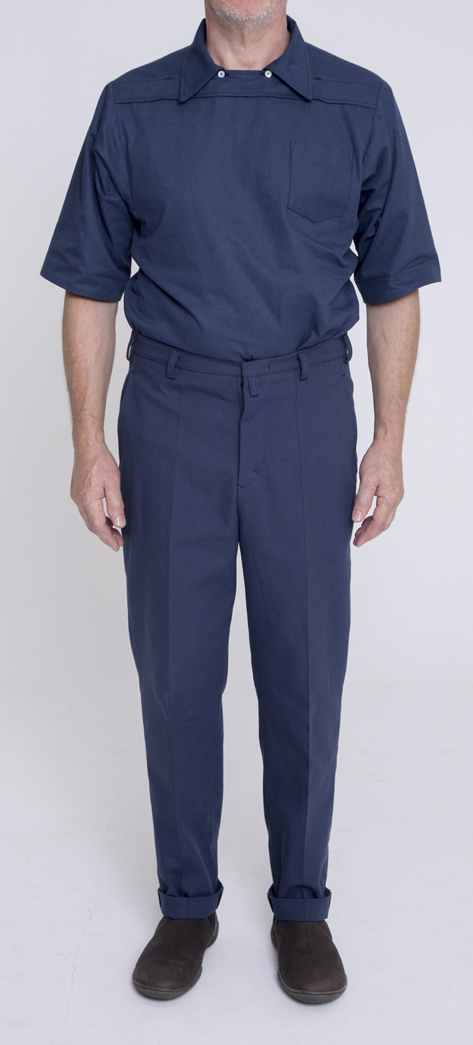 PEES: Das P-Shirt ist eine Variation zum FTSC und wird ebenso über den Kopf gezogen. Die asymmetrische Ausschnittform erinnert in geschlossenem Zustand an ein P. Der Rumpf ist wie beim FTSC mäßig weit und hat lange Ärmel. Wir fertigen dieses Modell sowohl in gemusterten als auch unifarbenen Bio-Baumwollqualitäten an. Hier abgebildet ist das Modell in einer geringelten köperbindigen Baumwolle in schwerer Grammatur. Auch in einer leichteren Chambray-Ware in einem grautönigen Changeant fertigen wir dieses Modell an. BSSS: Das Basismodell „Shirt“ mit dem Seitenkeil haben wir weiterentwickelt und zu diesem Schlupfhemd mit horizontaler Knopfleiste modifiziert. Für den Sommer kürzen wir die Ärmel bis auf Ellbogenlänge, die dann nach Belieben auch umgeschlagen werden können, siehe Outfit 2017.2.1. Durch den Seitenkeil erhält diese Hemdenform eine große Bewegungsfreiheit und Hebelänge für eine dynamische Armbewegung. Für die warme Jahreszeit schneiden wir das Hemd aus einer festen köperbindigen Bio-Baumwolle in ecru, geringelt und blau. GNH: Die Gatsby Hosenform als Langversion. Die Hosenform zeichnet sich durch einen geräumigen Leibbereich und ein zum Saum hin schmal zulaufendes Bein aus. Große Tascheneingriffe in der Voderhose und eine Gesäßtasche hinten rechts sorgen für Stauraum. Die Hose hat 8 Grütel- und eine Dornschlaufe oder wahlweise Knöpfe für Hosenträger. Für den Sommer fertigen wir die GNH in Bio-Baumwoll-Qualitäten wie Halbpanama und Köper.